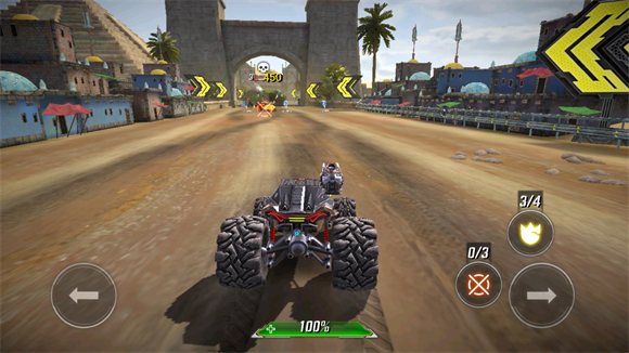 7、进入关卡后左右箭筒控制车辆的转向,蓝色的按钮是冲刺,紫色的按钮是终极技能,红色的瞄准是发射导弹,黄色的盾牌是护盾,这些按钮点击就可以使用。