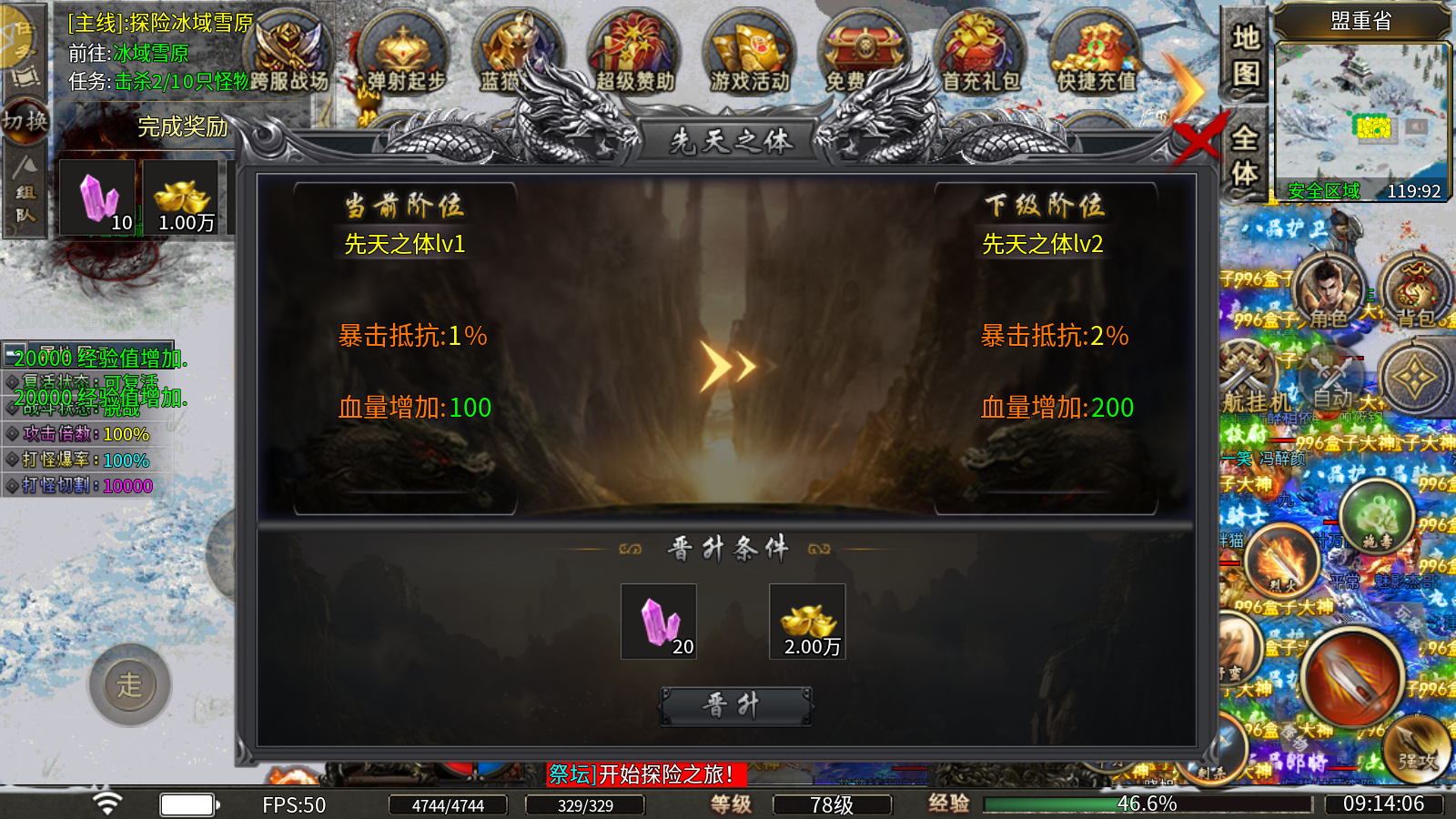 1、先天之体:消耗冰雪碎片和元宝即可晋升,每一级都能增加暴击抵抗,并且大幅增加生命值。