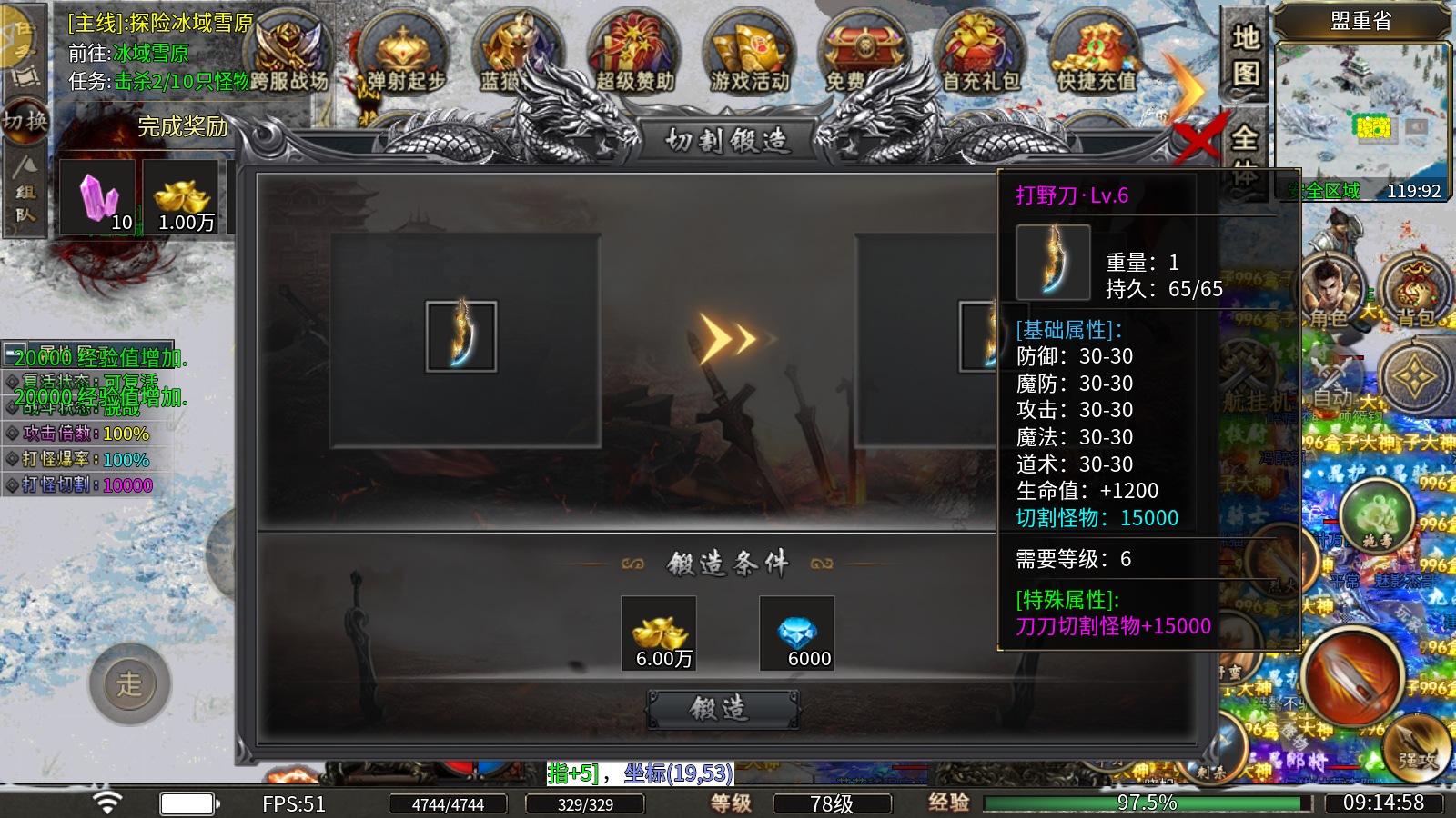 2、切割锻造:消耗元宝以及钻石即可对打野刀进行锻造,每一级不仅能够提高切割的伤害,还能获得攻魔道等全名属性加成。