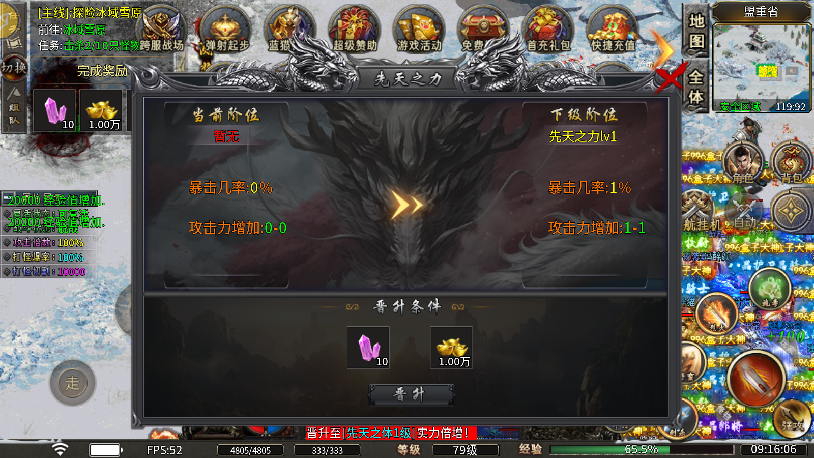 3、先天之力:消耗冰雪碎片和元宝即可晋升,能够提高攻击力以及暴击几率,提高打怪效率。
