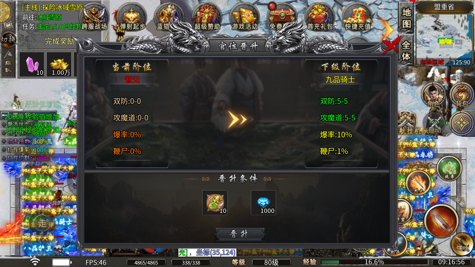 4、官位晋升:小号钻石和官位证明即可晋升,提高双防和攻魔道属性的同时,还能提升爆率以及鞭尸。