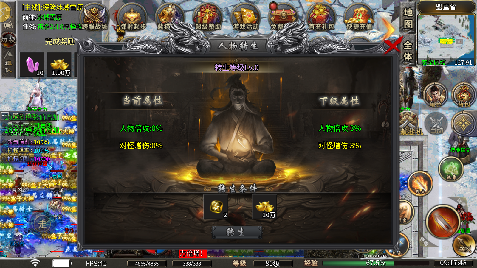 5、人物转生:消耗转生石和元宝即可对人物进行转生,提高人物倍攻以及对怪的增伤。
