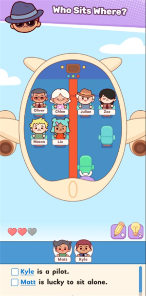 在这款游戏中,你需要为各类角色规划座位布局。依据关卡底部的指引,把不同角色安置到对应的座位上。每个关卡都有数量不等的角色等待你分配座位。一旦角色被放置到错误的位置,就会减少一颗爱心。请在爱心数量耗尽前,将所有角色都安排到正确的座位上。