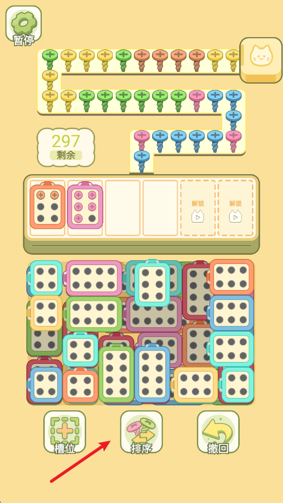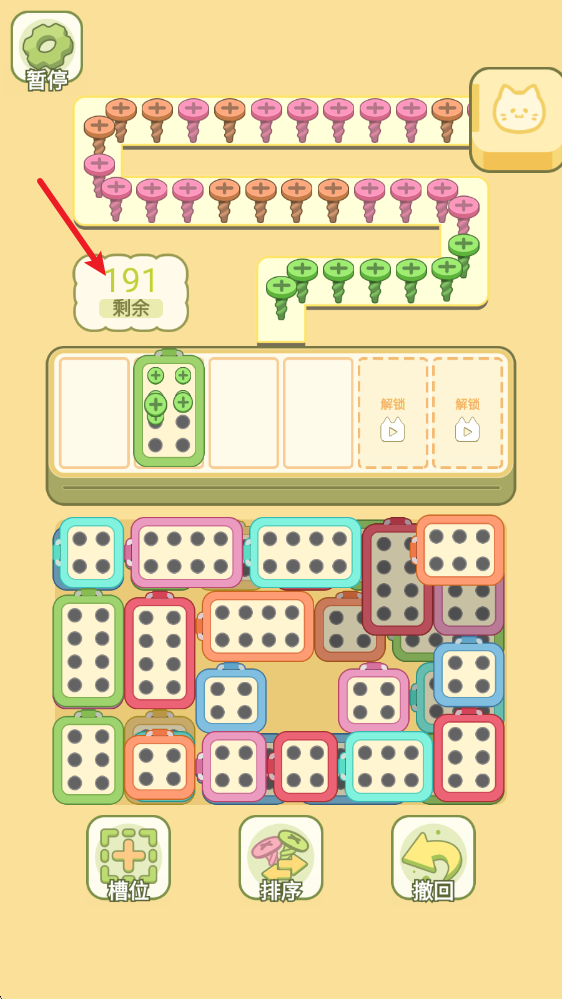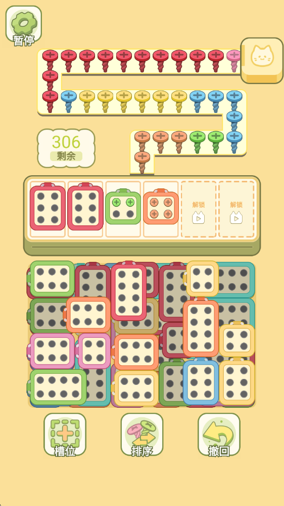 1、开启挑战后,在上方可以看到各种颜色的螺丝,下方则是对应颜色的螺丝盒。