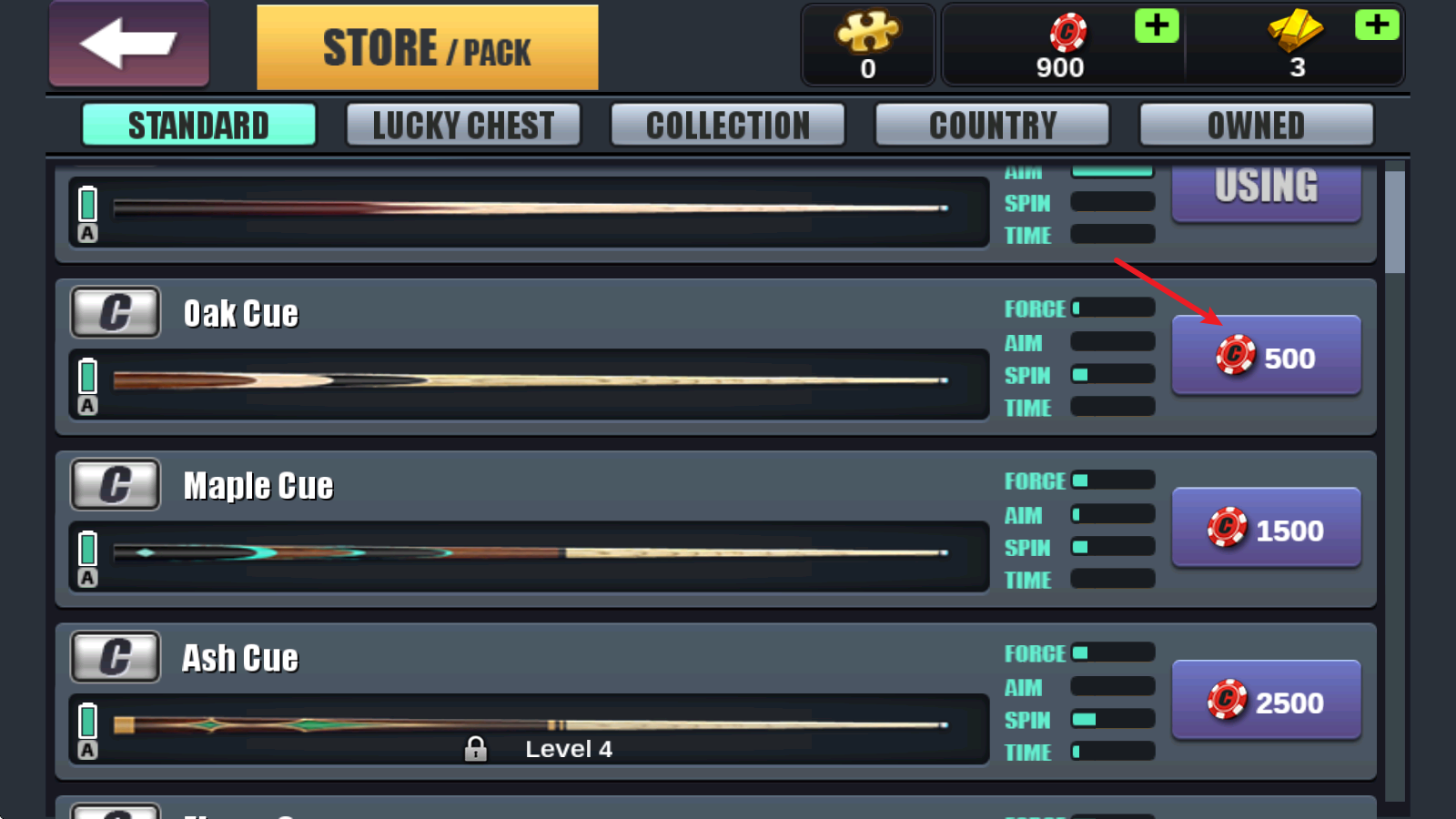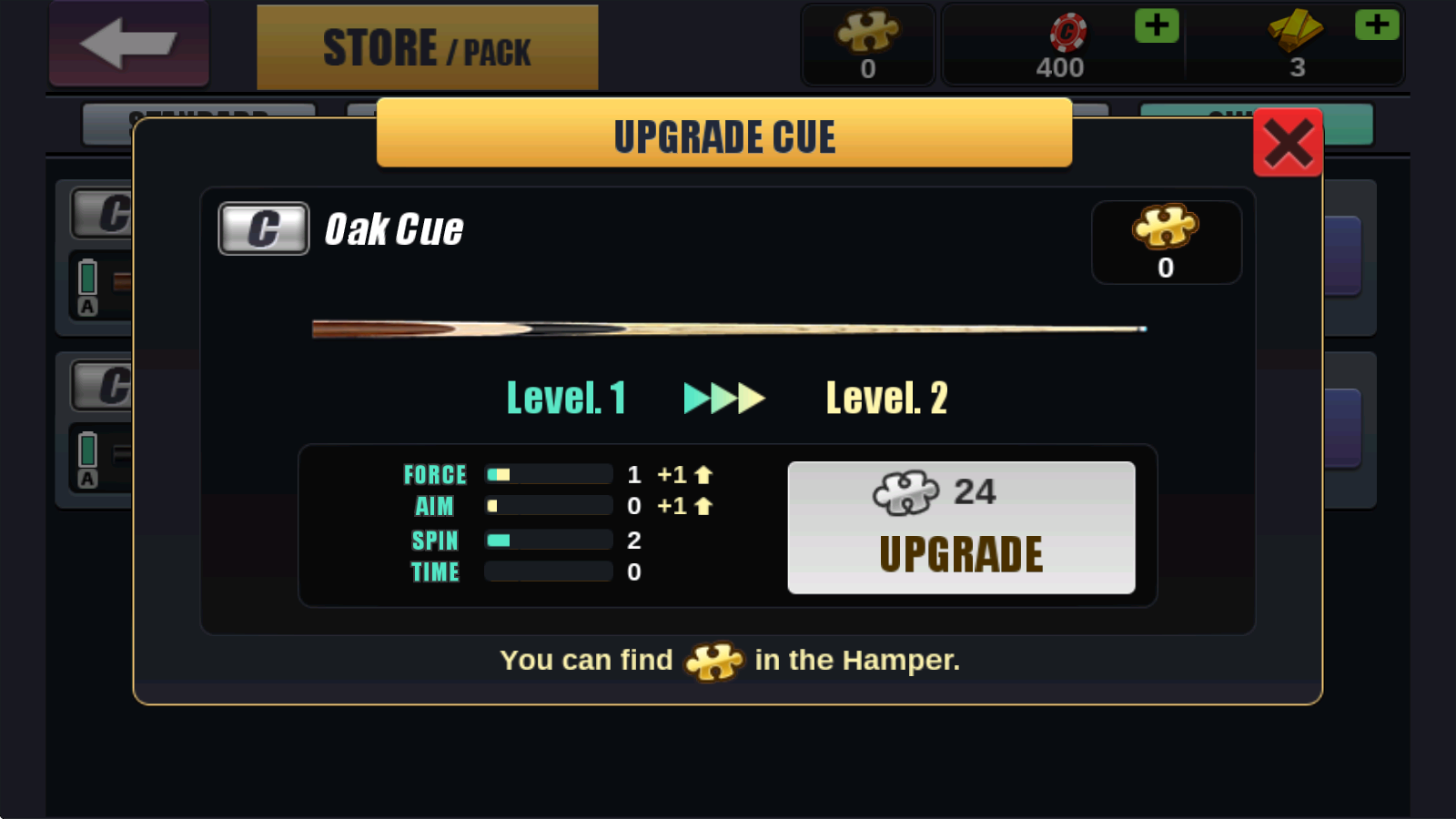 3、赚取更多的筹码,去购买解锁各种各样好看的球台和球杆,近百根球杆和多个球桌供您选择,让你的比赛更精彩。