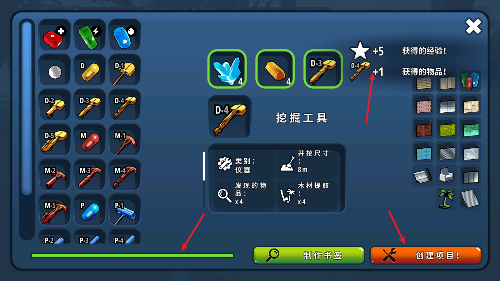 6、在点击右下角的创建项目后就会消耗对应材料开始制作,待左下角读条完了之后就会得到物品,并获得经验。