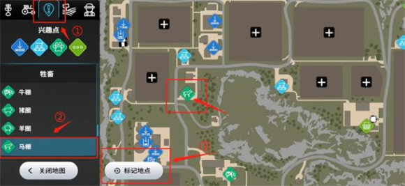 1、养马需要先解锁马棚才可以进行培养,解锁马棚的位置位于地图的左上角,是一个标志颜色为绿色的棱形马匹图标,要去这里只需要点击【标记地图】就会在游戏中出现地点指引了。