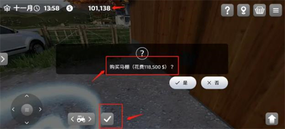 2、马棚的价格为11850$,我们新游戏的初始金币为100000$,所以是不够的,新手可以先玩一会赚点钱,或者用卖载具的办法赚点钱再来买。