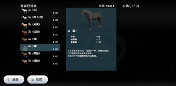 3、购买马棚后再马棚旁边会有一个图标,点击这个图标或者去地图右上角的动物商店可以购买马匹,游戏中的马匹除了颜色不一样之外其他都一样,一律售价500$+快捷购买300$,如果你能开动物运输车去右上角的动物商人那购买则可省去300$的运输费用。