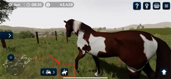 5、当玩家购买马匹后,靠近马匹就会在界面下方出现骑乘的图标,这时点一下图标就可以骑马了。每一匹马都有年龄,22个月以下的马都是幼年马,乘骑它们会训练它们的体能,以便于卖出更好的价格。