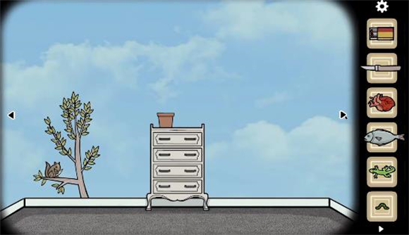 2、抽屉柜中,第一个和第三个抽屉是提示,最后一个的抽屉里有一个砝码。将左上角处点击放大后,每个云移动到特定位置就会变成某个形象,全部云都完成变化后可以得到最后的钟表提示七点二十五。