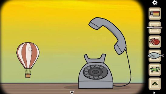 4、去电话处接听电话后点击rise up,并点击出现的热气球。切换到立钟场景,放大热气球后使用火柴点火,热气球升起后使用小刀割下袋子,最后打开袋子得到天平、沙土、一个密码盒。