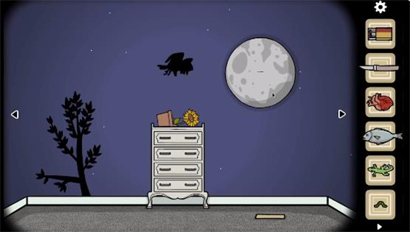 7、晚上的抽屉柜这里,有一只猫头鹰,点击后飞走,立钟上多出一只猫头鹰。同时边上的月亮使用小刀划开后拖动眼睛看向四周,可以看到四个密码,这个密码用在立钟下面的盒子上。