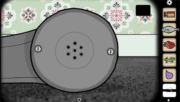 3、电话这里,多次点击电话就能让电话掉下来,对掉在地上的听筒点击放大后使用小刀取掉两个螺丝,打开听筒,完成接线,点击发光的地方两次,得到花瓣。