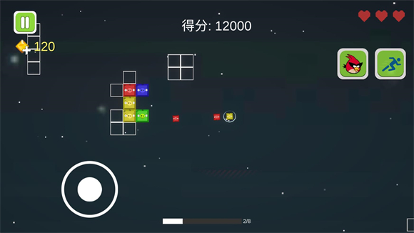 2、进入关卡后左边控制移动,点击屏幕可以发射不同颜色的方块猪。