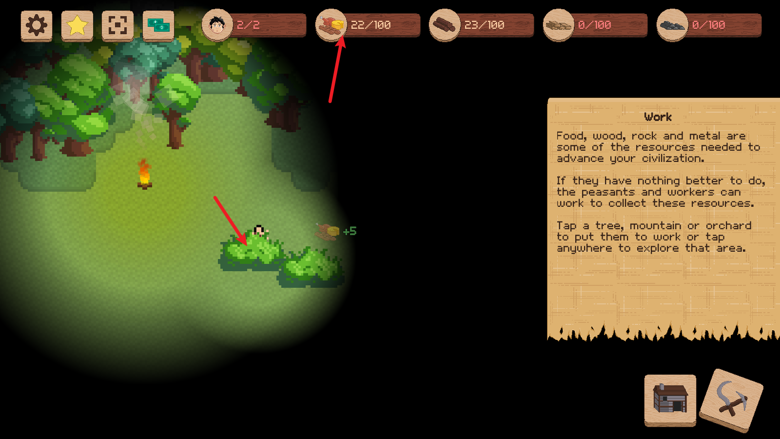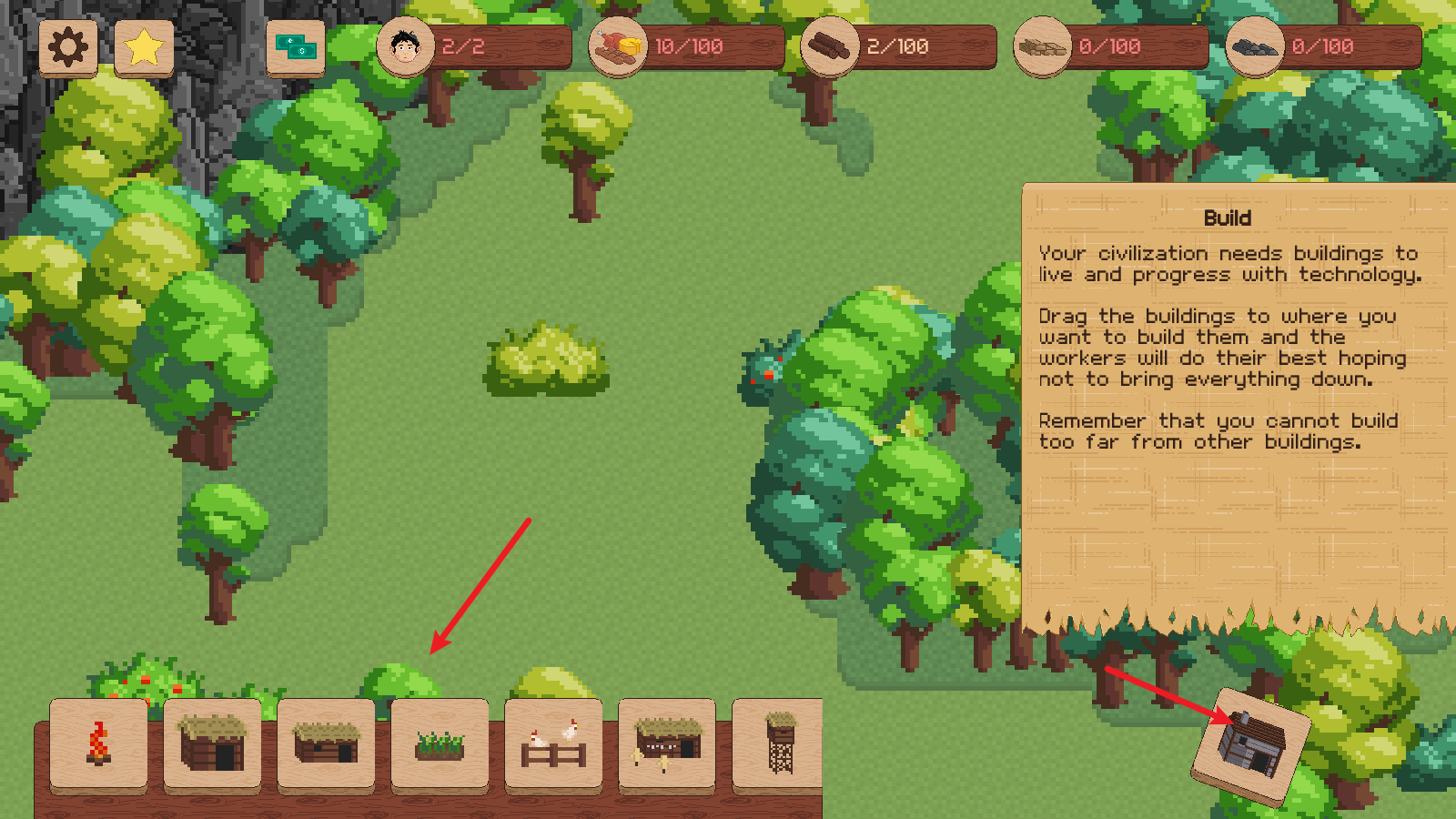 6、有了足够的木材后,我们可以去建造起第一个小屋,这样就能有更多的人口了。