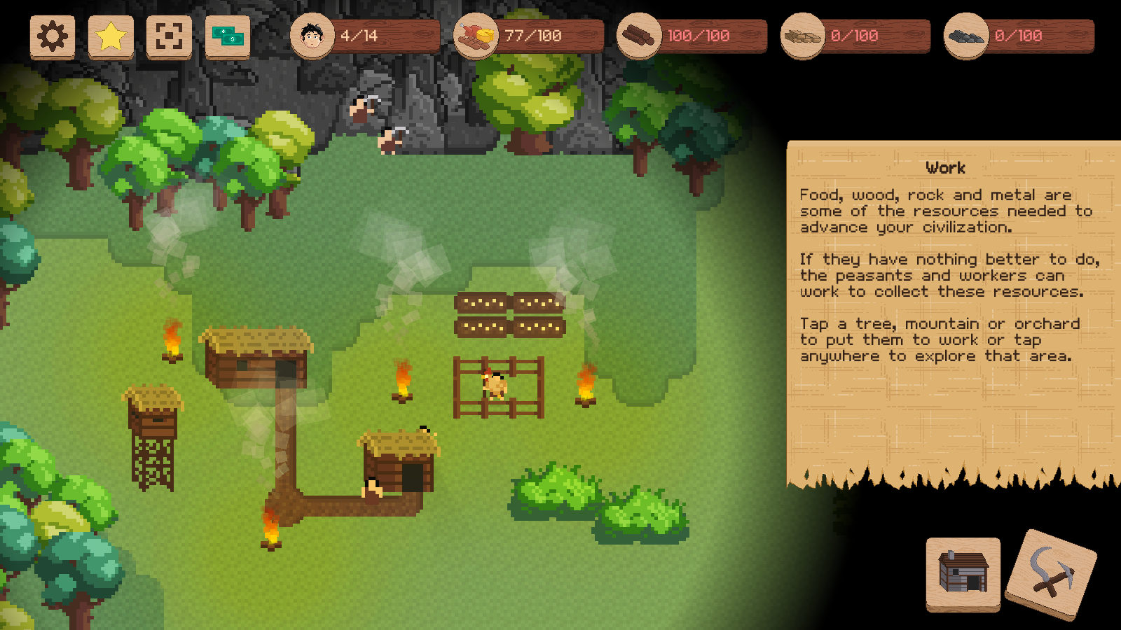 领土战争,一款像素艺术风格的实时策略经营类游戏。,游戏中你需要控制自己的人口去采集木材、矿石、食物等资源,然后在自己的领土上建造起各种设施,逐步的发展自己的部落,让人口和占地一步步的扩大,并随时注意地狱敌人的推进!最终将自己的领土扩张到最大,变得最强!