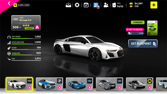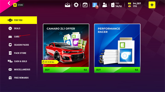 3、你可以点击左侧的ABCDE来选择不同等级的车辆,然后选择想要购买的车辆来解锁。
