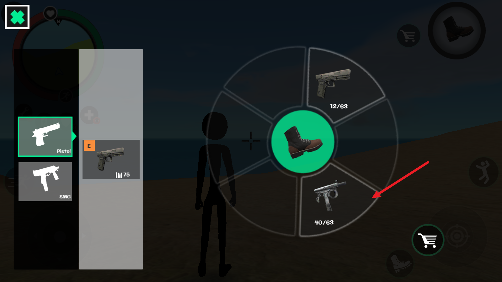 7、点击右上角的鞋子按钮即可进入武器切换界面,点击即可切换武器使用。