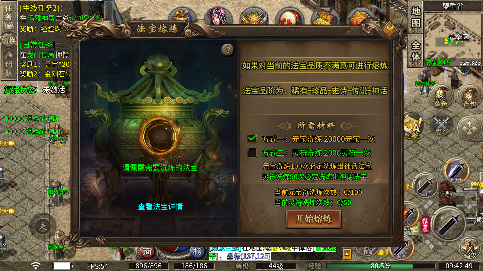 3、法宝洗练:可消耗元宝或者灵符对法宝进行洗练,如果对当前的法宝品质不满意可进行熔炼,法宝品阶为:稀有-珍品-史诗-传说-神话。