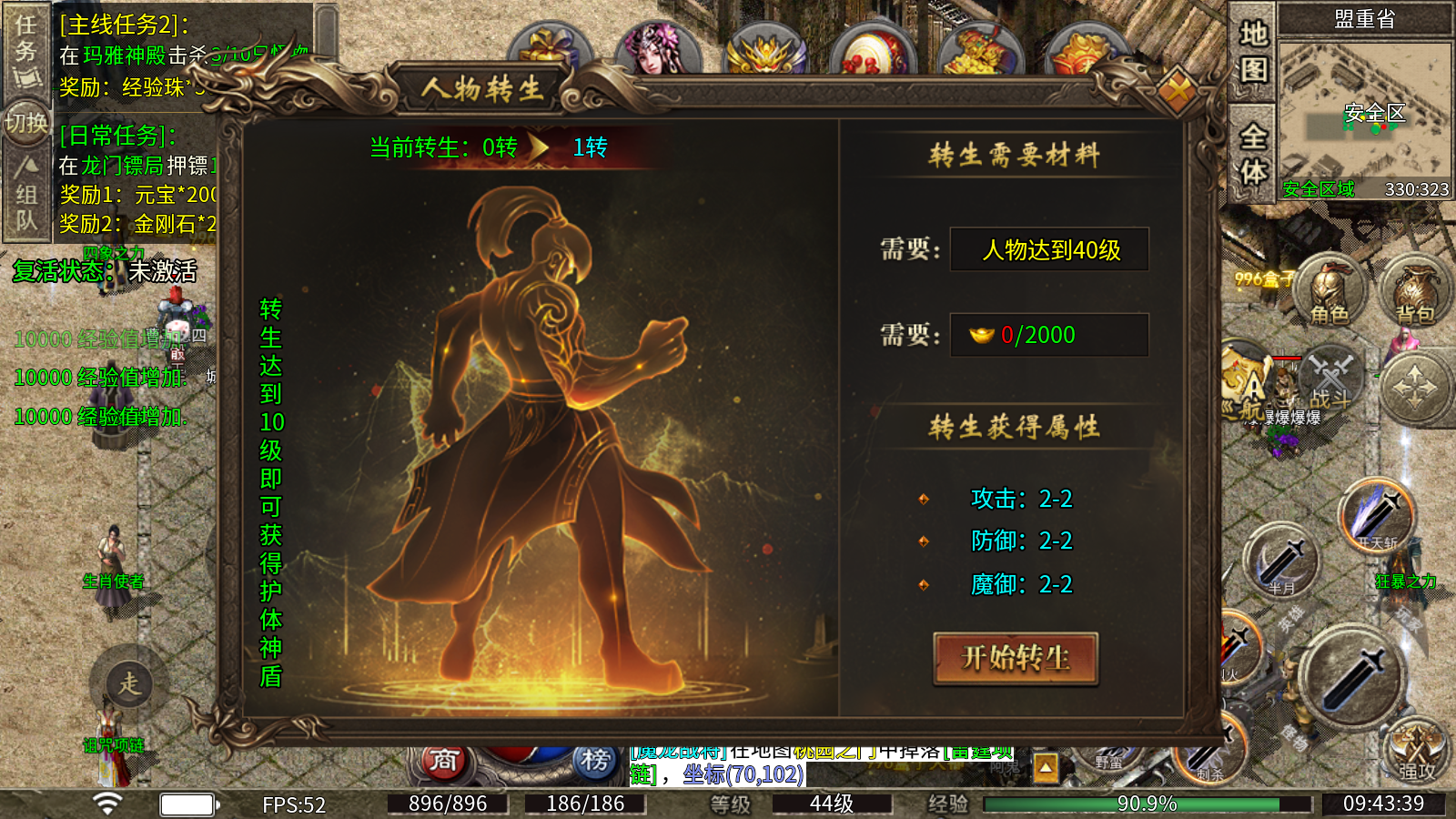 4、转生使者:人物等级到达40级后就能够消耗元宝转生,可以获得不错的属性,转生到达10级就能够获得护体神盾。