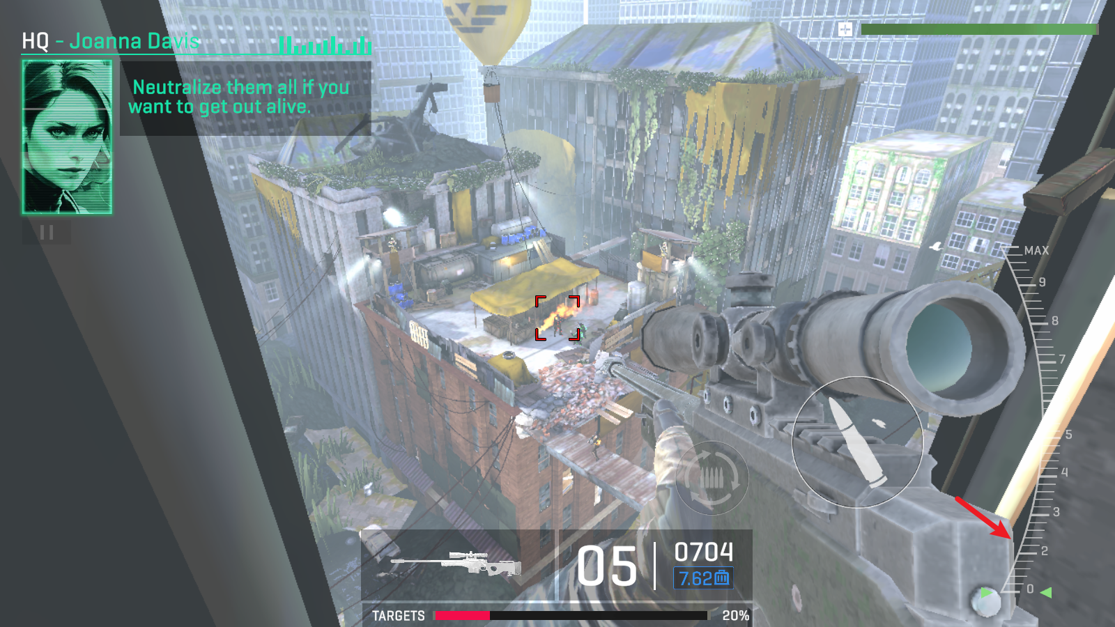 4、部分场景还会切换到狙击枪,拖动右侧的按钮即可开启瞄准镜,进行距离的调整。