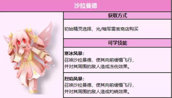 1、输出精灵:输出精灵推荐沙拉曼德,如果加入了光阵营可以直接领取,两天满任务白送精灵。两个技能区别不大,所以点哪个无所谓。
