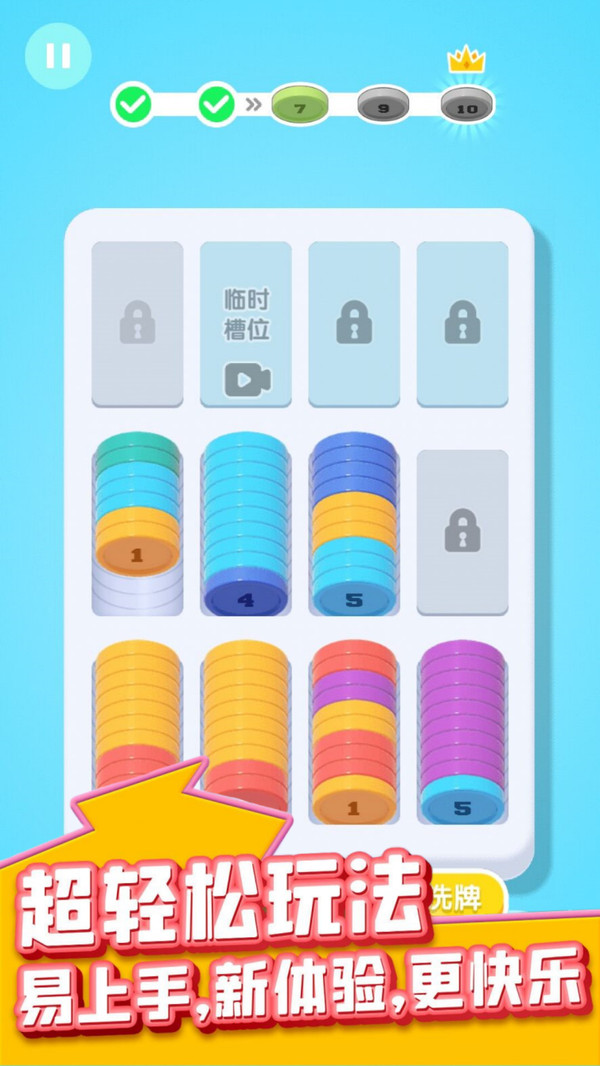 玩家能够通过拖动的方式,把筹码从一个槽位移至另一个槽位。相同颜色的筹码需作为整体移动,玩家可移动1至9个同色筹码,并将其放置到同色槽位上进行叠放。