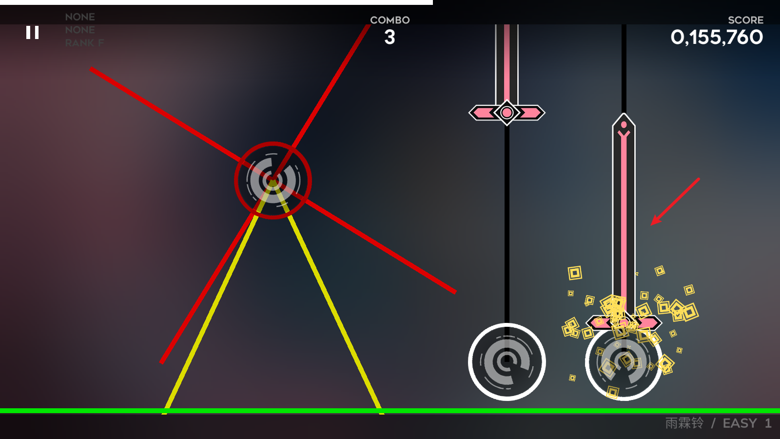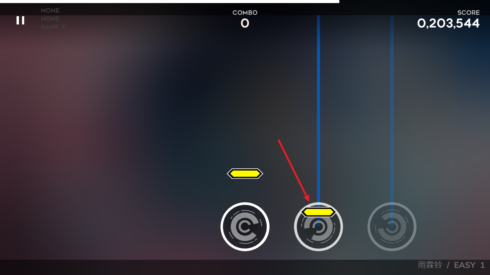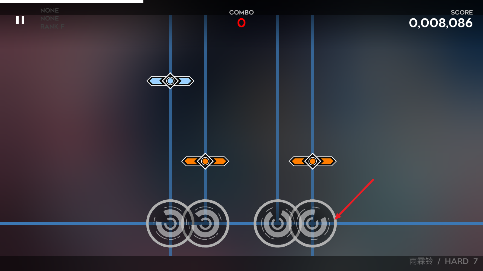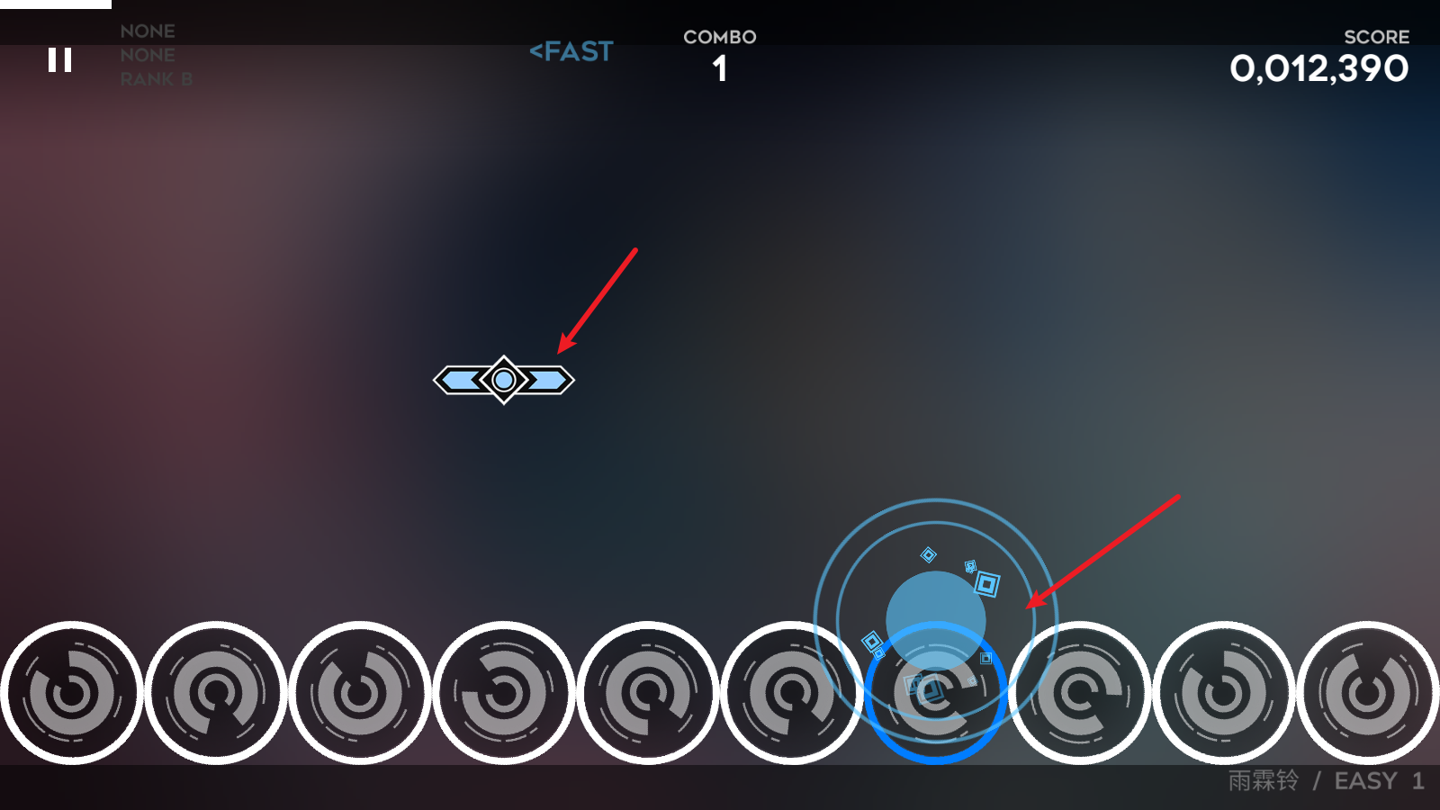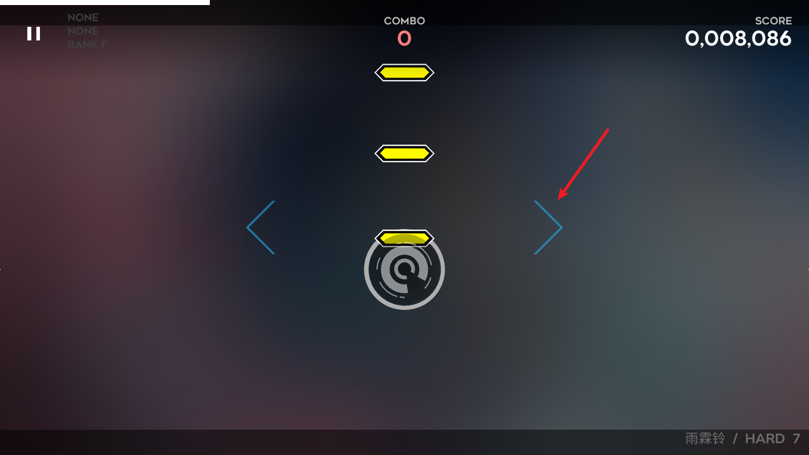 7、当屏幕中心出现<>符号时,代表空间判定范围会进行扩大,可以在更远的距离点到note。当屏幕中心出现><符号时,代表空间判定范围会进行缩小,需要点的更准一些。