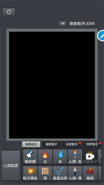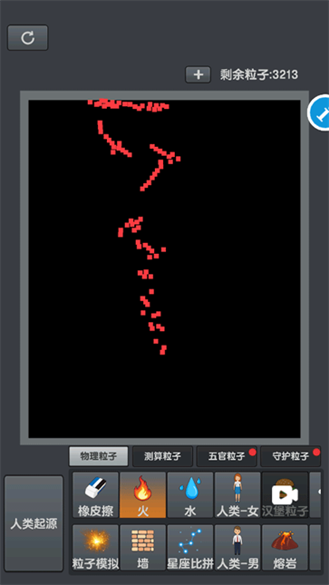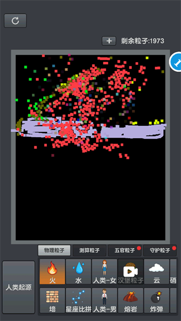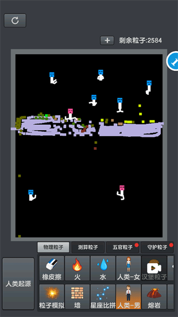 1在这个平台完成安装后,启动游戏便能看到界面下方陈列着丰富多样的粒子类型,可供用户进行创造与模拟操作,涵盖物理类、测算类、五官结构类等不同范畴的粒子选项。