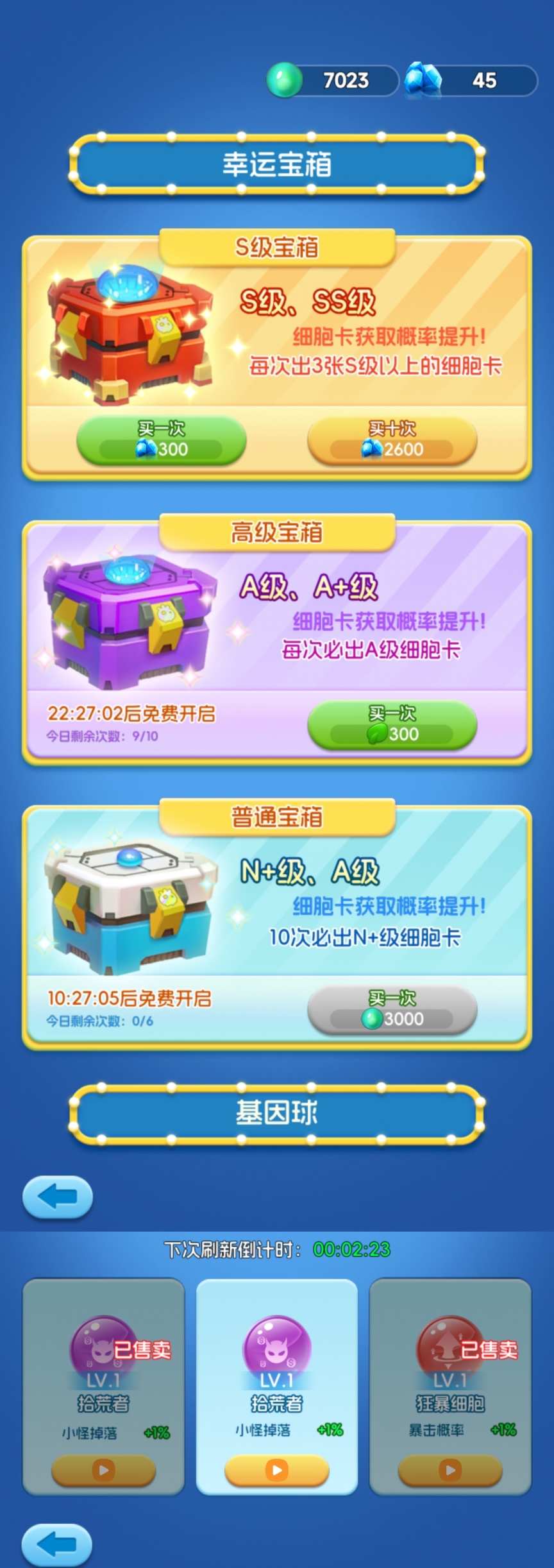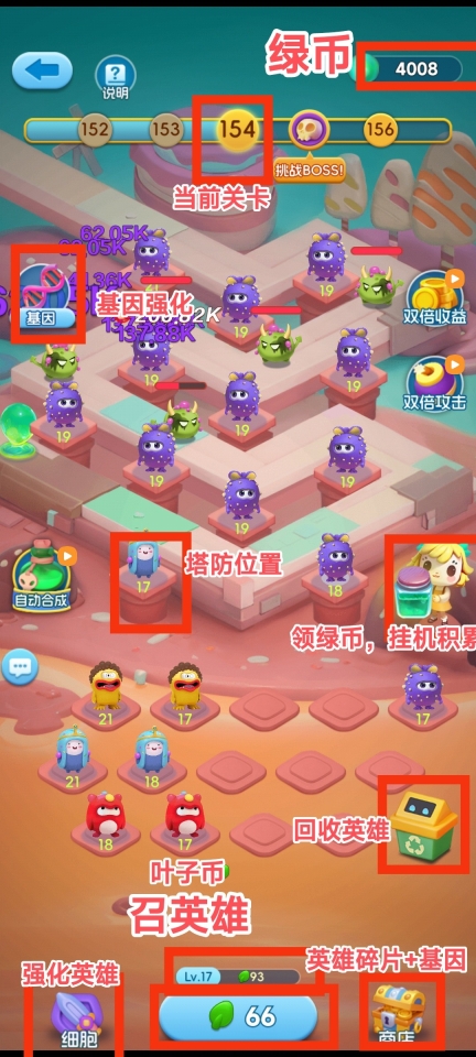 消耗叶子币可在细胞界面随机召唤能上场的英雄。将两个完全相同(包括等级一致)的英雄拖至一处即可合成(即便处于塔防位置也能操作),合成后会得到等级提升一级的随机上场英雄。