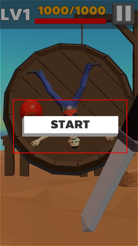 1、进入LV1界面后,圆盘上的角色呈倒立状态,点击START按钮即可启动游戏,为投掷飞刀的挑战做好准备。