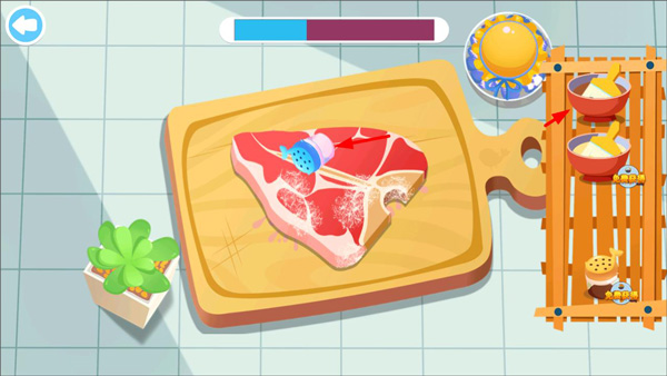 4、然后点击右侧的调料对牛排进行腌制;