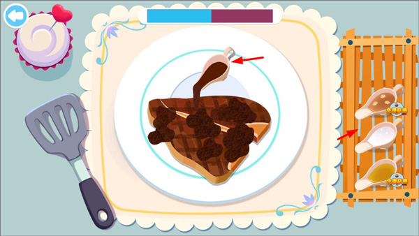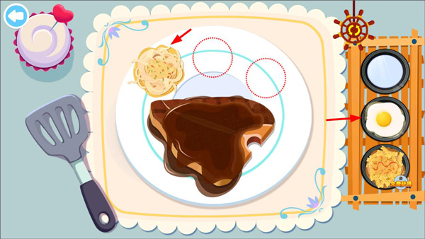 7在牛排淋上酱汁后,玩家需要依据客人的具体要求,从右侧的配餐选项中挑选合适的菜品添加到餐盘内。