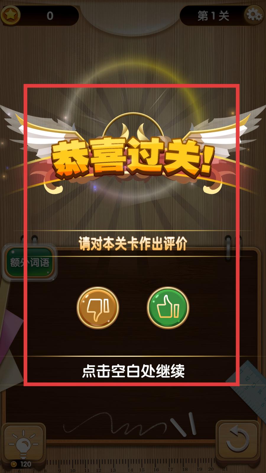 4、当成功拼出足够数量的词语后,游戏界面会弹出恭喜通关的提示,同时设有本关卡的评价选项,点击空白区域就能进入下一关继续游戏。