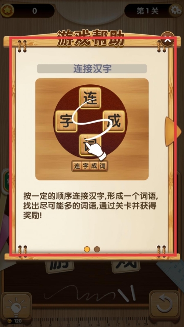 2、进入游戏帮助界面,界面展示连接汉字的游戏规则,即按一定顺序连接汉字形成词语,找出尽可能多的词语以通过关卡并获得奖励,关闭帮助界面进入第1关游戏界面。