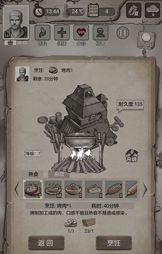 1回到住处后,要是浆果类的食物已经消耗殆尽,就可以准备一些烤肉。烤肉这种烹饪方式能以较低的成本,将原本无法直接食用的生肉转化为可食用的食物,在相关技术尚未发展起来的时候,比那些需要消耗两根木材来烤制的素食要实用得多。