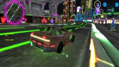 借助防护装置避开阻碍物,向前行进时,留意周围闪烁的霓虹灯光。