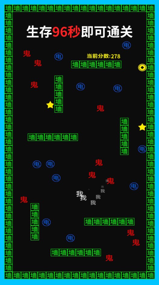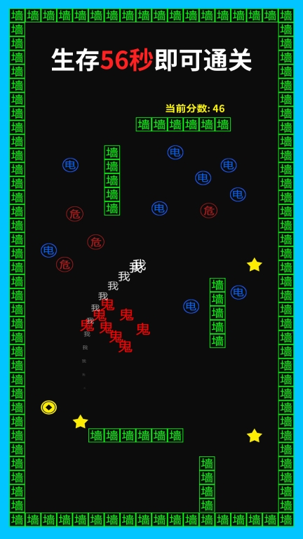 在这款以文字为载体的生存冒险游戏里,屏幕中会浮现出各类汉字元素。玩家需要操控代表自身的“我”字在界面中自由移动,同时必须时刻留意规避“电”与“鬼”这两个危险字符。游戏过程中,玩家往往会陷入手忙脚乱的状态,但恰恰是这种紧张慌忙的体验,让游戏的惊险刺激感展现得淋漓尽致。