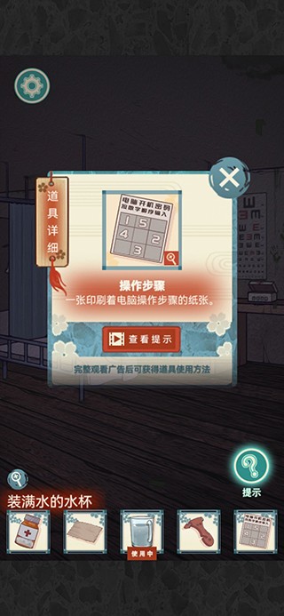 3、桌子上箱子的密码,需依照那个红色视力表的方向(左右左下)来获取玻璃药瓶与麻布(麻布同样要用水壶沾湿)