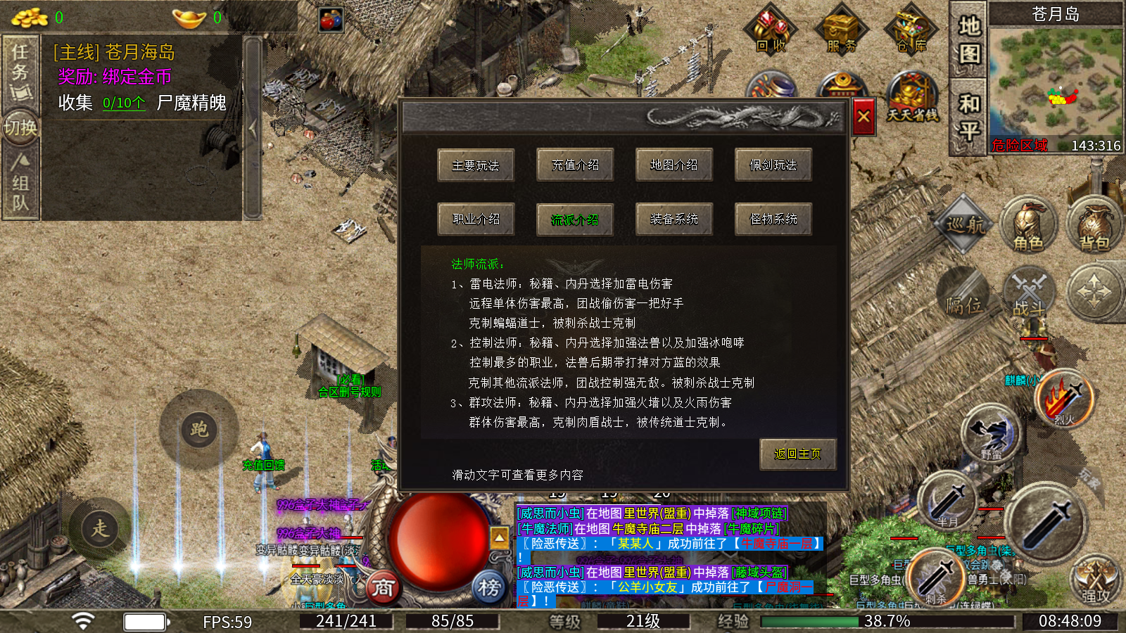 3、群攻法师:秘籍、内丹选择加强火墙以及火雨伤害,群体伤害最高,克制肉盾战士,被传统道士克制。