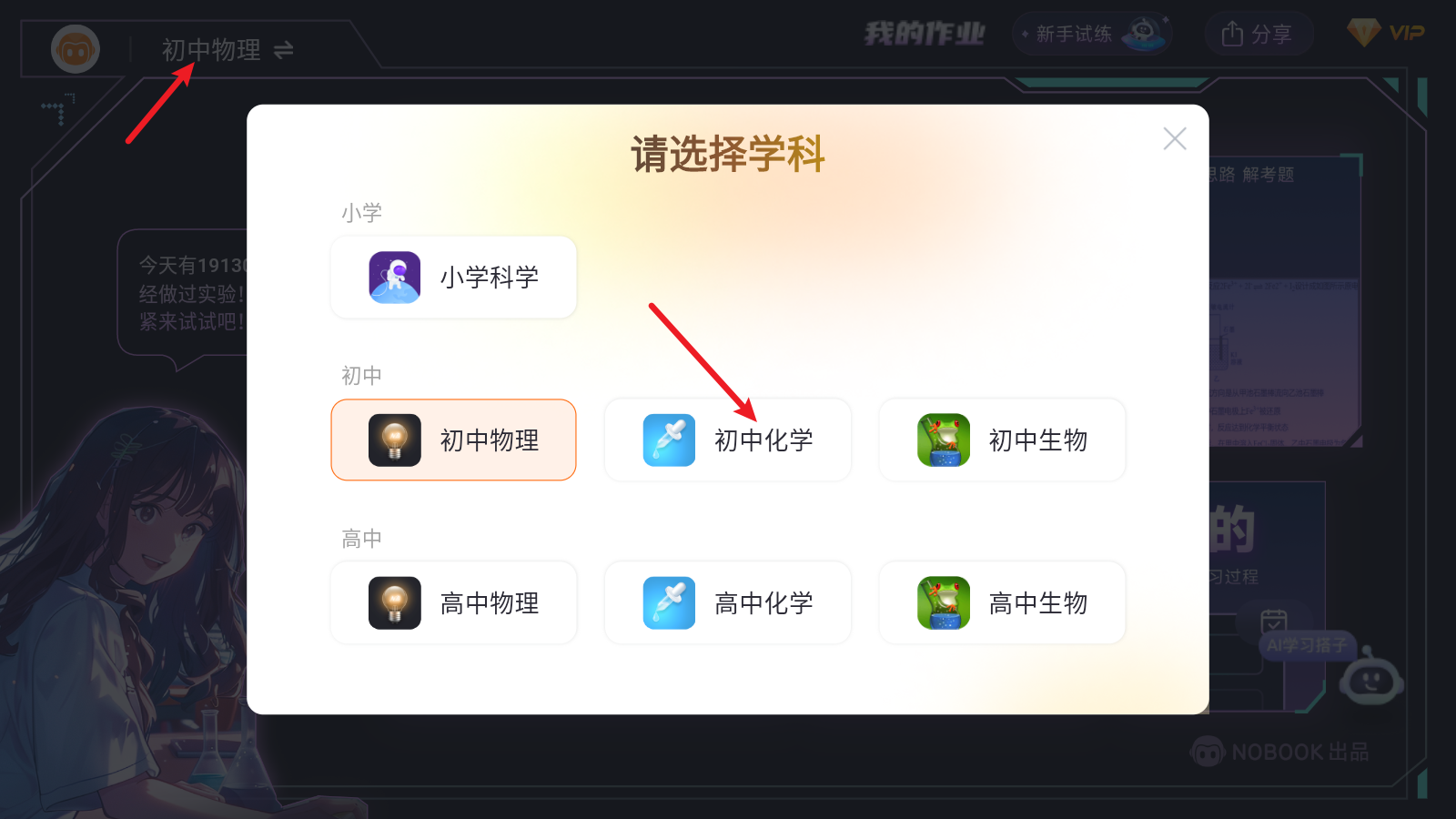 1、首先我们需要将实验科目调整为化学。