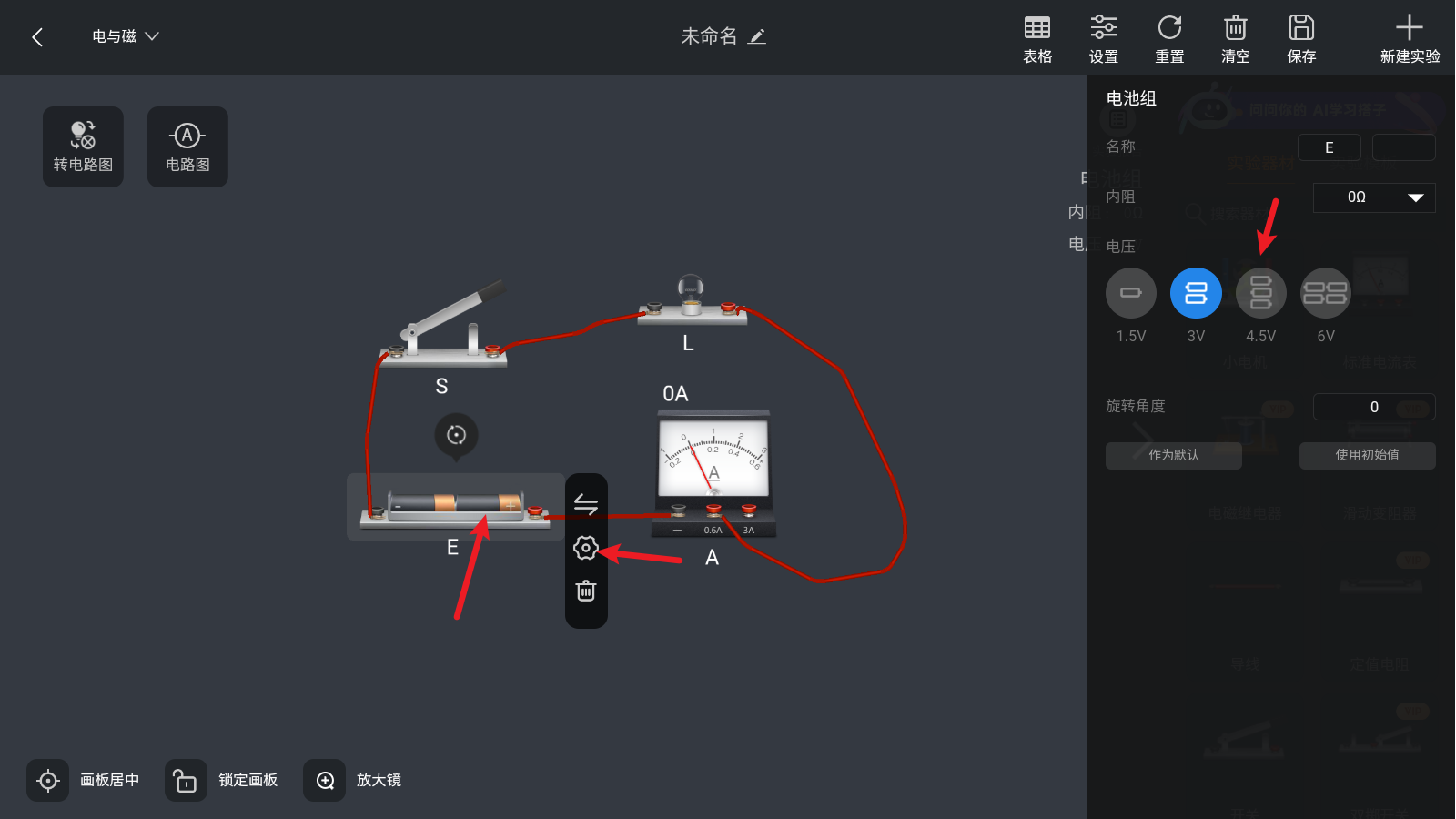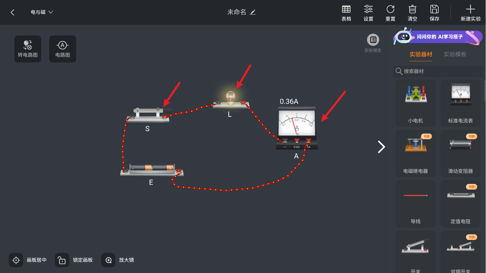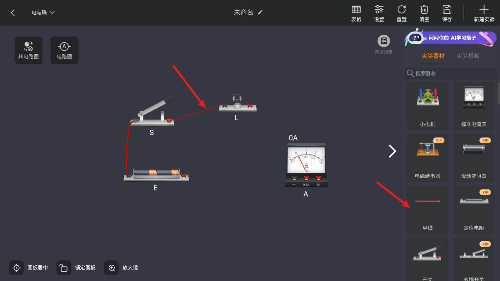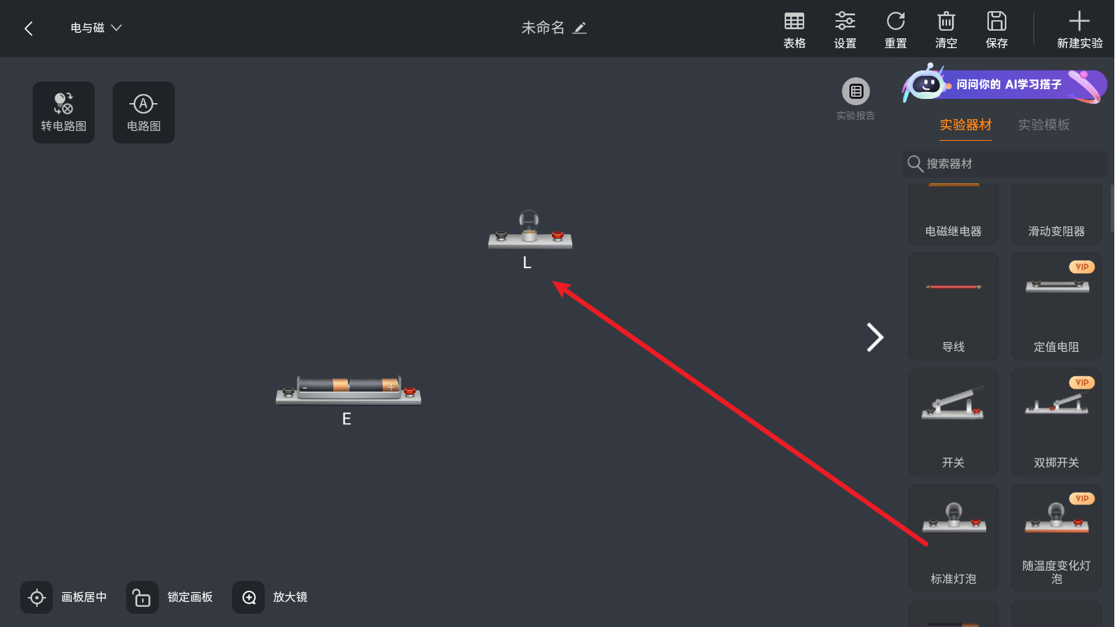 3、以最简单的电路实验为例,拖动右侧的仪器即可使用。