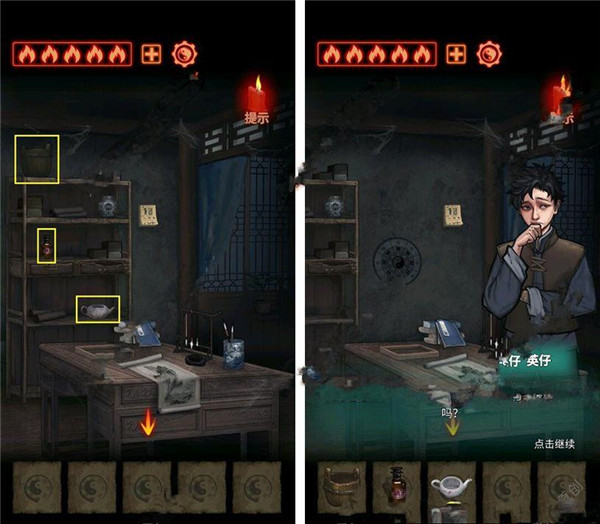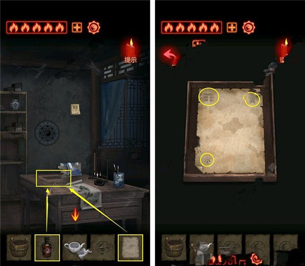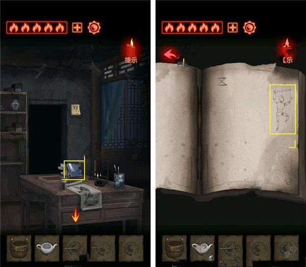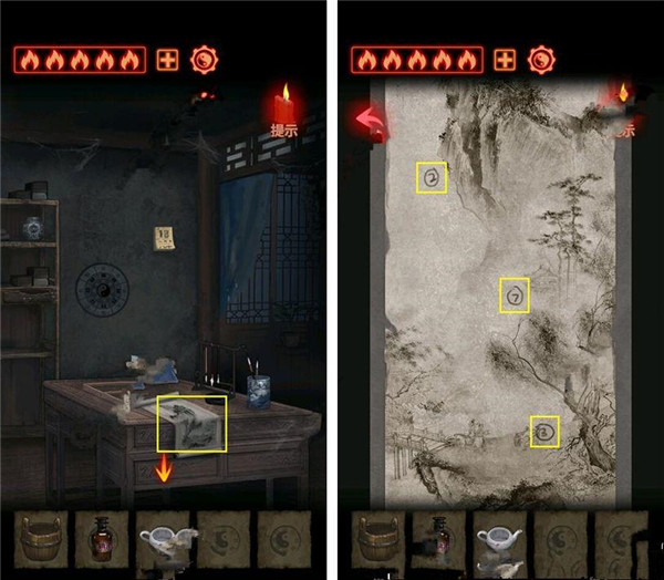 1. 从书架上取下水桶、碘酒与茶壶,接着点击书架右侧将其推开,密道就藏在这里。
