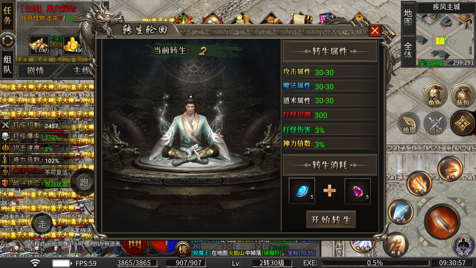 4、人物转生:消耗转世石以及境界石即可转生,每次转生都能提供高额的攻魔道属性加成,还有切割和打怪伤害都有一定的提升,最重要的是可以提高神力倍数!