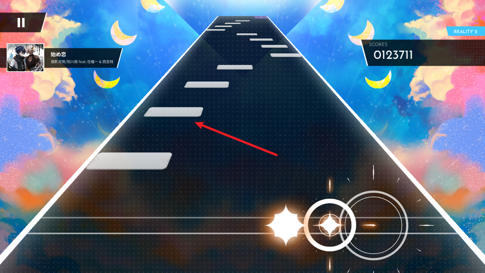 4、选择好曲目后就可以开始了,首先是最简单的音符,当它到达判定线后点击即可。