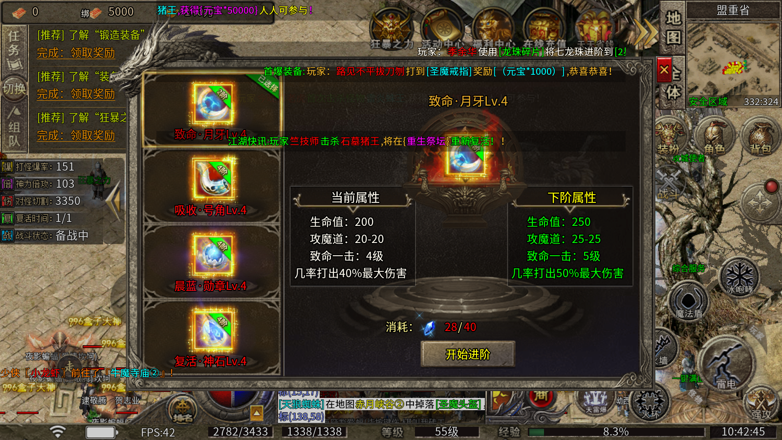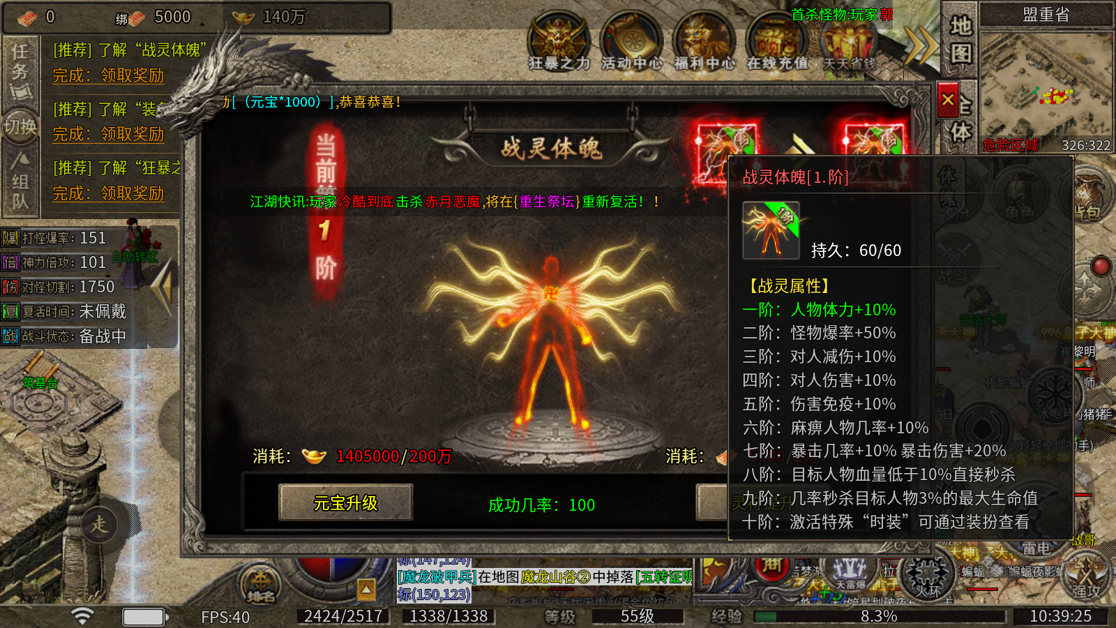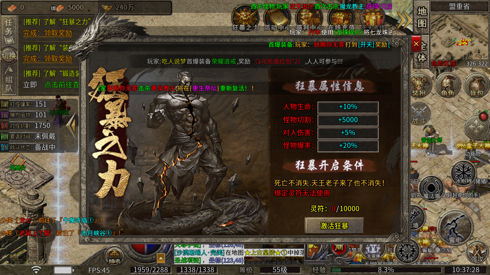 1、狂暴之力:消耗灵符即可开启,获得对怪切割、对人伤害和生命加成,还能大幅提升怪物爆率!死亡不会消失!