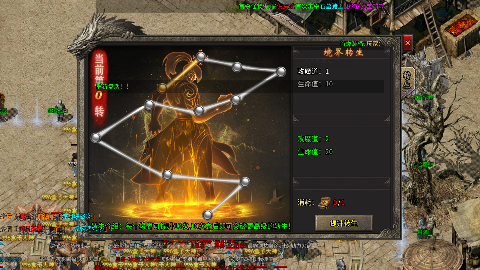 4、转世轮回:消耗转生证明即可进行提升,提供攻魔道和生命属性加成,每个境界可提升10次,10次之后即可突破更高级的转生!