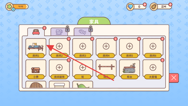 2、进入房屋装饰界面后,挑选红色箭头指向的家具来布置房间,以此增强房间的美观度与舒适度。