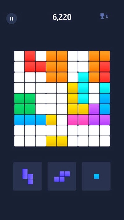 这是一款极易让人沉浸其中的方块消除游戏。规则十分直观:把底部的方块组拖拽到8×8的方格区域内,只要横向或纵向凑成完整一行就能完成消除。不过它真的像听起来那么轻松吗?答案或许是否定的——据说不少玩家连20分都难以突破!现在就来挑战一下,看看你的最高得分能达到多少吧!